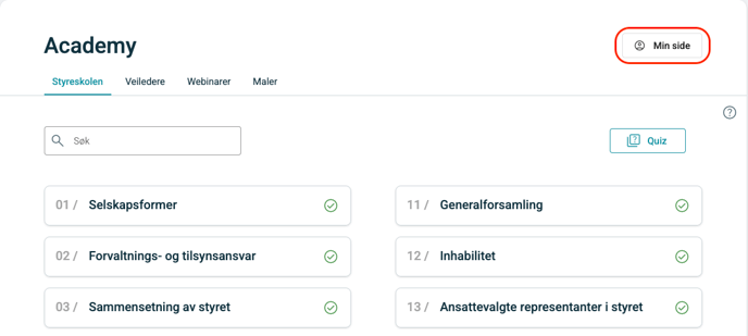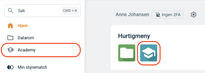 Når du logger deg inn, vil du komme til en startside med oversikt over de funksjonalitetene du har tilgang til. Klikk i venstremenyen eller under Hurtigmeny på Academy for å gå til Styreskolen.