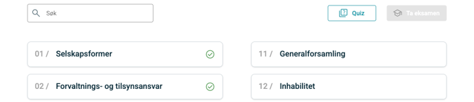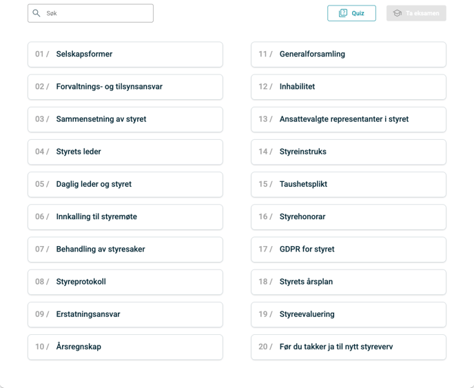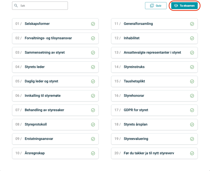 Når alle 20 moduler er gjennomgått, kan du ta eksamen.
