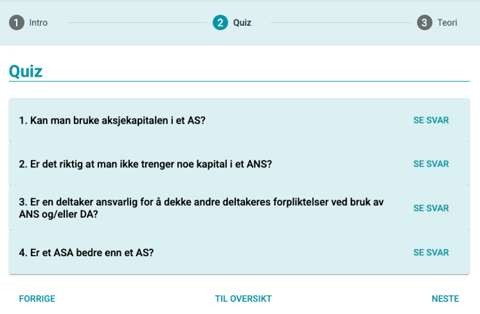 Neste del er en Quiz. Test deg selv og sjekk om du kan svare på sentrale spørsmål relatert til temaet.