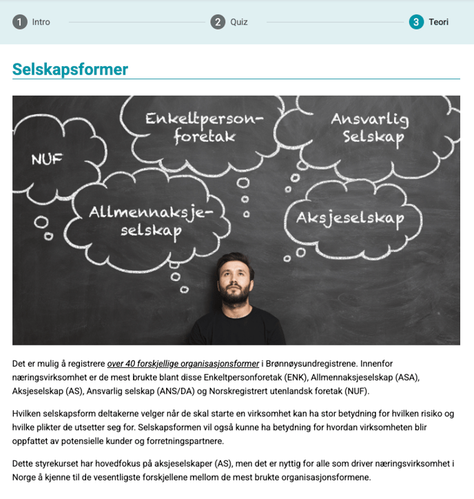 Første del av modulene er en «Intro-case». Her sitter noen styremedlemmer og diskuterer det aktuelle temaet for modulen. Intro-casen er ment å belyse hvorfor dette temaet er viktig.