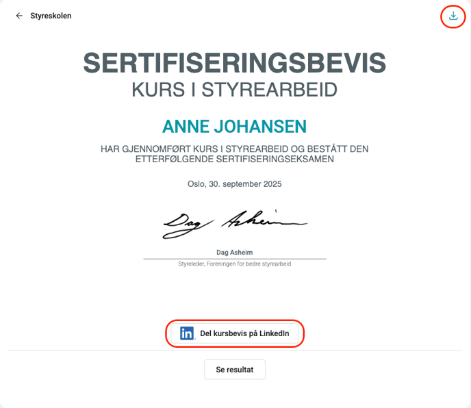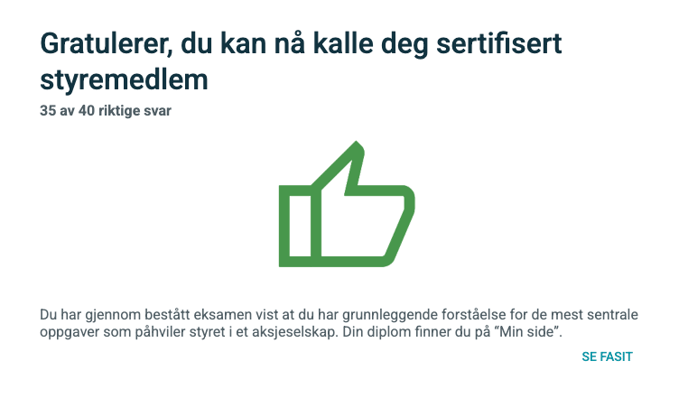 Gratulerer. Du er nå sertifisert styremedlem fra Foreningen for bedre styrearbeid. Diplomet kan lastes ned. Du kan også dele kursbeviset på LinkedIn.