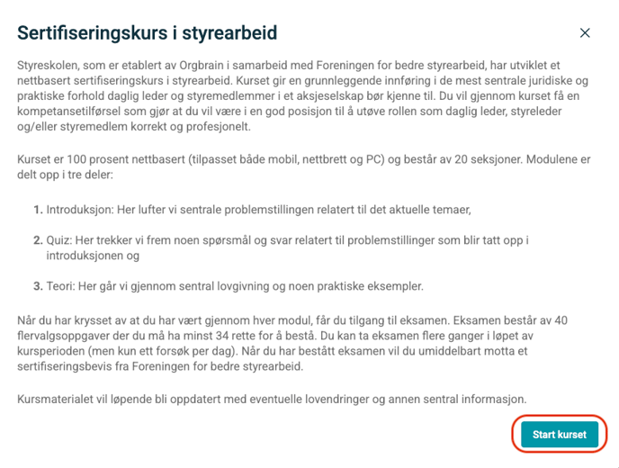 Du kommer direkte til sertifiseringskurset. Klikk på Start kurset for å sette i gang.