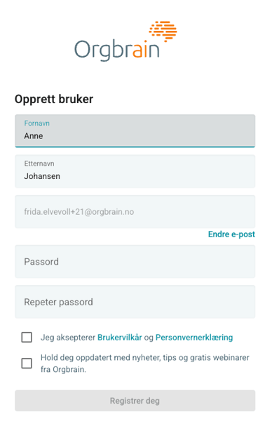 Du kan justere måten navnet ditt skrives på dersom dette ikke er korrekt. Det er også anledning til å velge en annen e-postadresse, noe som er særlig fornuftig dersom det vil samle all Orgbrain-bruk på samme e-postadresse. Deretter må du legge inn et personlige passord som du ønsker å benytte, krysse av for avtalevilkårene, og til slutt klikke på registreringsknappen.