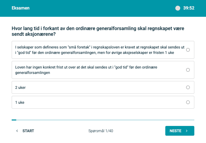 Eksamen består av 40 spørsmål med kun 1 rett svar per spørsmål. For å bestå må du svare riktig på minst 34 av spørsmålene. Du har inntil 40 minutter til å svare på samtlige spørsmål. Innenfor tidsrammen kan du gå frem og tilbake og endre svar.