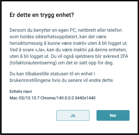 Når du har klikket på registreringsknappen, får du spørsmål om dette er en privat eller trygg enhet du er logget inn på. Dersom du benytter en PC eller annen enhet som du ikke er din, eller som du ikke anser som trygg, bør du svare nei.