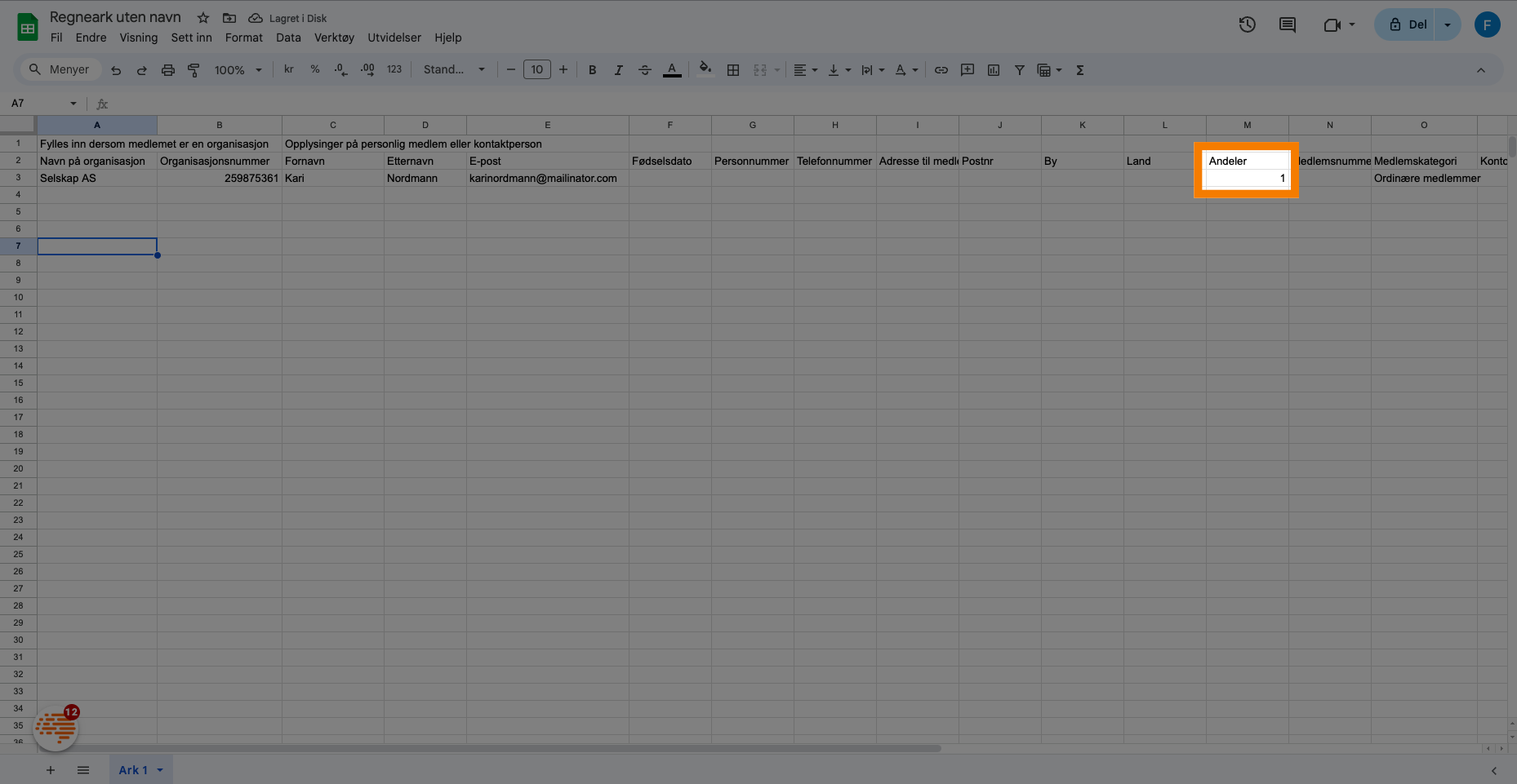 Det må legges inn andeler som knyttes til medlemskategorien. Videre vil jeg nå vise den informasjonen som kan legges inn